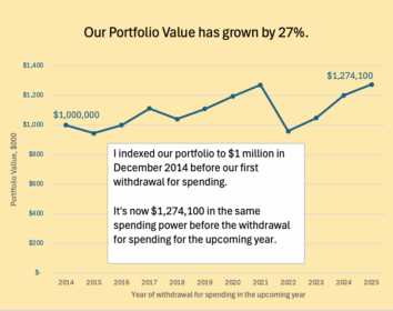 Our investment portfolio is +27% more in real spending power than we had in December 2014 despite withdrawals that have been more than half of the amount we started with.