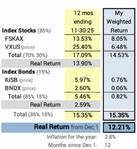 I use the 12 months ending November 30 to calculate our Safe Spending Amount for the upcoming year (SSA, Chapter 2, Nest Egg Care [NEC]): that’s what we can safely sell from our portfolio for our spending and know that we will not outlive our portfolio. Our real portfolio return for the year was 12.2%. That works out to be 6.0% real increase for our SSA. If your portfolio is similar to ours and you are younger, you would calculate to a greater increase: you would have withdrawn a smaller percentage last year.