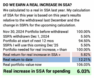 Conclusion: I calculate our Safe Spending Amount (SSA) for the upcoming year based on our 12-month returns ending November 30. Our real portfolio return was 12.2%. That’s nearly twice the expected return rate on our portfolio of 6.4%. I calculate 6.1% real increase for our SSA. Those younger with a similar mix of stocks and bonds will calculate to a greater increase: they withdrew a smaller percentage for their SSA last year.