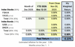 I’ll use this spreadsheet to track how well our portfolio is doing for our calculation year ending November 30, 2026: will we calculate to an increase in our Safe Spending Amount for 2027? (SSA. Chapter 2, Nest Egg Care [NEC]) If you use this date, you can use this spreadsheet. This spreadsheet is a lot simpler than ones I’ve provided in the past.