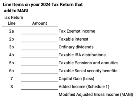 MAGI for purposes of IRMAA on your 2024 return was line 11 + line 2a: Adjusted Gross Income (AGI) + Tax-Exempt interest. I display all the lines that add to AGI and MAGI. You can download a sheet here.
